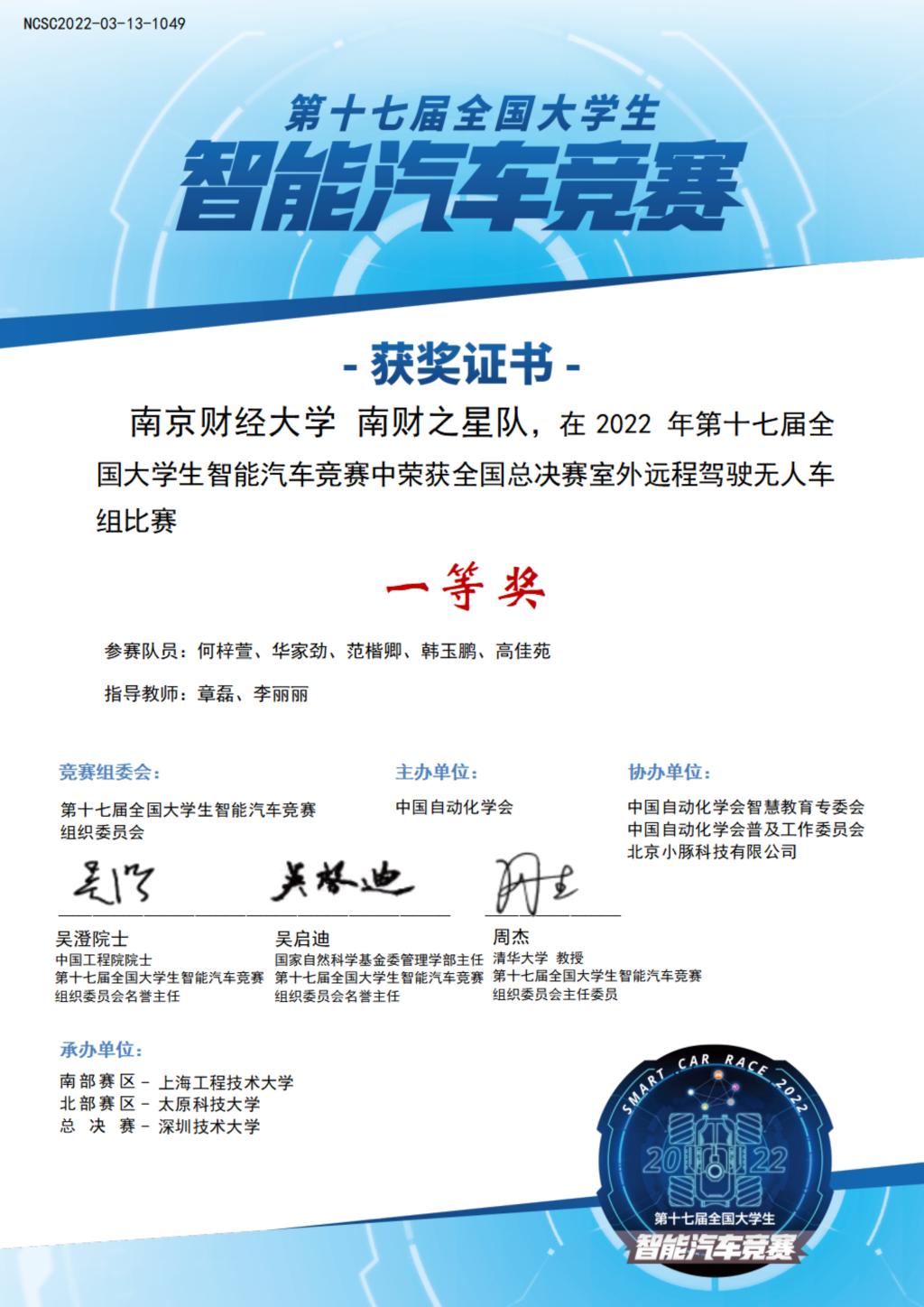近日,由中国自动化学会主办的第十七届全国大学生智能汽车竞赛室外专项全国总决赛收官。经过激烈角逐,由我院何梓萱、华家劲、范楷卿、韩玉鹏、高佳苑等5名学生组成的“南财之星”代表队斩获“室外远程驾驶无人车”比赛一等奖。学院章磊、李丽丽老师获得优秀指导教师奖。同时,该团队在2022年中国大学生计算机设计大赛、中国机器人大赛等比赛中获得国家级二等奖1项、三等奖2项。