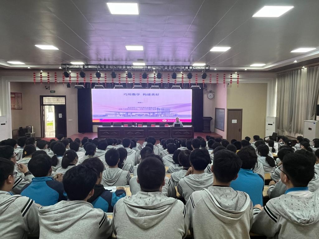 在泗阳致远中学报告厅,马健副书记分别从学校概况、就业去向、招生政策等三个方面介绍我校总体情况,并向同学们发出诚挚邀请,邀请他们到南财走一走、看一看。随后,杨靖三副教授以“巧用数学 构建美好”为题,用一个简单的数学例子为切入点,用通俗易懂的语言介绍了数学建模是什么,以及数学建模在现实生活中的广泛应用,杨老师鼓励同学们用心学好数学,期待未来能在南财校园与同学们一起探讨数学的魅力。