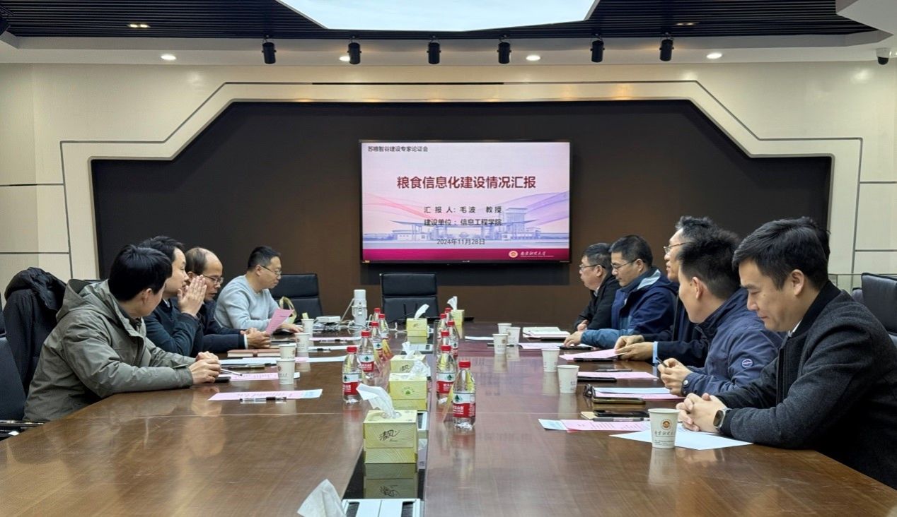 为推进苏粮智谷高水平社会服务平台建设,切实增强粮食信息化科技创新能力,发挥苏粮智谷在江苏“科技兴粮兴储”方面的重要引领示范作用,11月28日上午,苏粮智谷建设专家论证会在WilliamHill威廉希尔仙林校区德业楼211会议室召开。我院特邀来自江苏省粮食集团、南粮集团、无锡中粮工科、苏州苏垦现代农业发展有限公司、中储粮江苏质检中心、江苏有线数据网络有限责任公司等单位的专家对苏粮智谷建设情况进行专业指导和论证把关。校科研院院长方勇、食品科学与工程学院院长唐培安、信息工程学院院长黄健、信息工程学院院长助理毛波、食品科学与工程学院教授万忠民等参加会议。