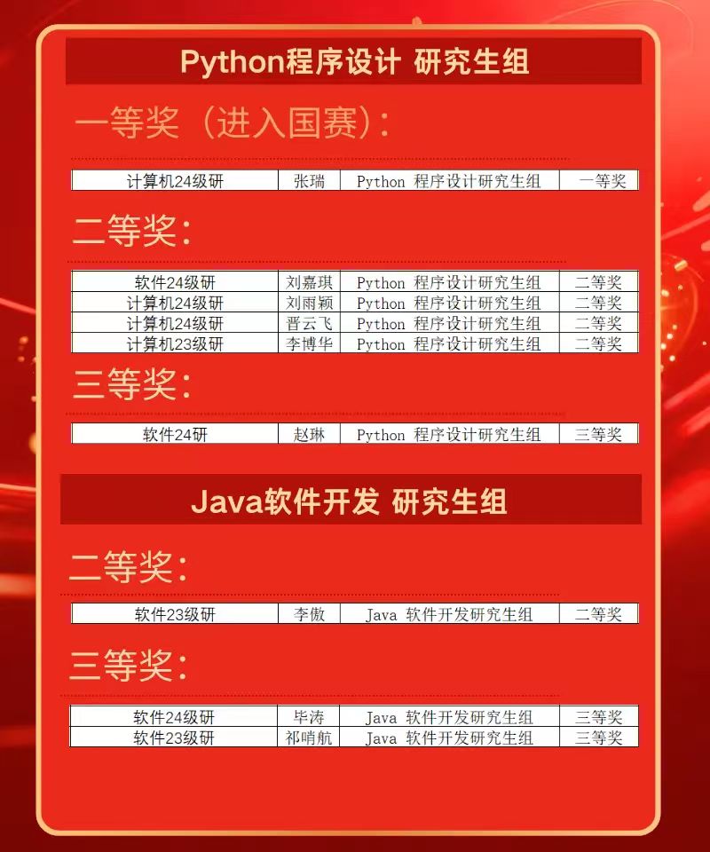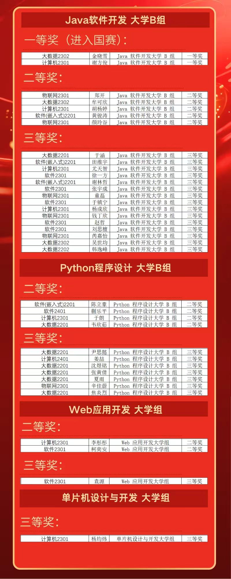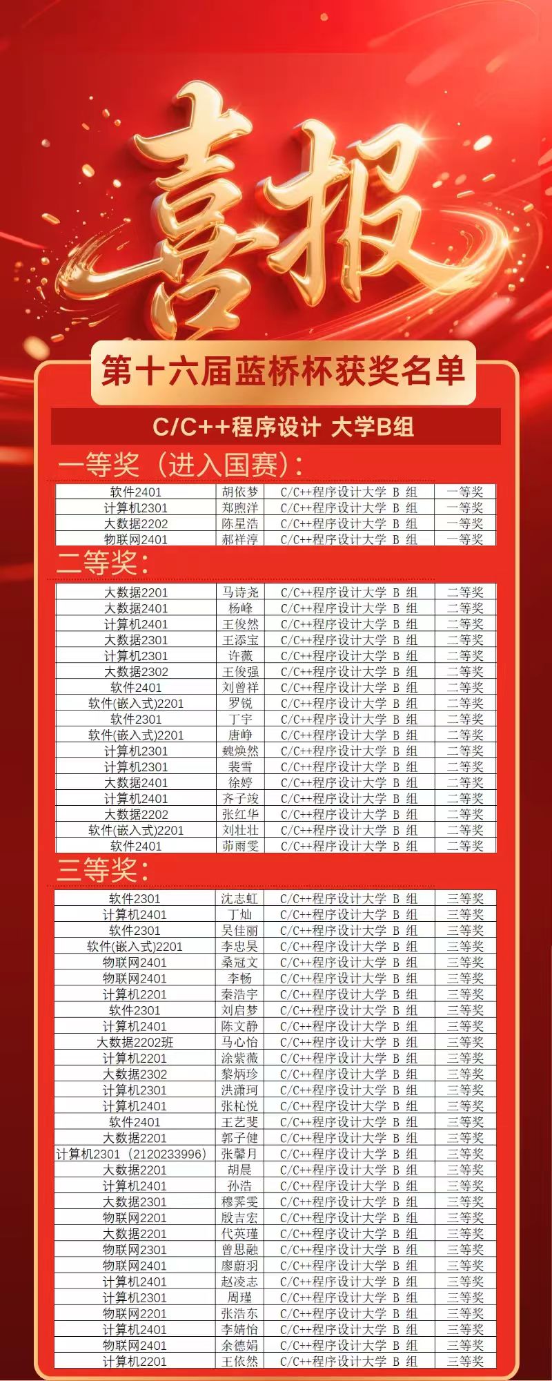 近日,第十六届“蓝桥杯”全国软件和信息技术专业人才大赛(软件赛/电子赛)省赛成绩公布,我院共有100名学生获奖,其中一等奖9人、二等奖33人、三等奖58人,获C/C++程序设计大学B组一等奖的付学强、胡依梦、郑煦洋、陈星浩、郝祥淳、张轶博,获Java软件开发大学B组一等奖的金晓雪、谢方俊,以及获Python 程序设计研究生组一等奖的张瑞晋级国赛。