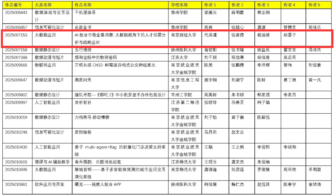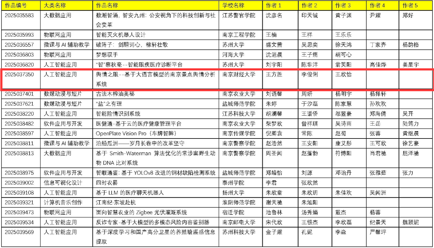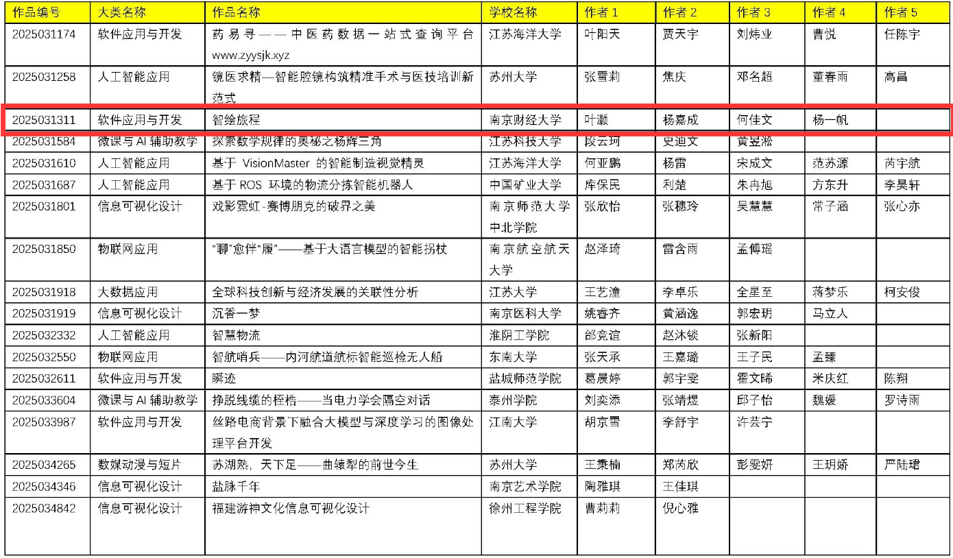 袁超、徐鑫源、朱念生、杨光、王莉春同学的《FusionAR:室内复杂场景下的视觉﹣地标协同导航系统》(指导老师:朱利涛)项目斩获二等奖,晋级国赛;王方胜、李俊俐、王欣怡同学的《舆情之眼——基于大语言模型的南京景点舆情分析系统》(指导老师:朱桂祥)、代英瑾、张黄倩、杨迪越、胡晏子同学设计的《AI就业市场全景洞察:大数据视角下的人才供需分析与战略应对》(指导老师:蒋伟伟)、 叶灏、杨嘉成、何佳文、杨一帆同学创作的《智绘旅程》(指导老师:李树青)获得三等奖。这些作品选题新颖,紧密结合人工智能、大数据等前沿技术,展现了解决实际问题的创新思路,充分体现了我院学生扎实的专业知识、良好的创新能力和实践动手能力。
