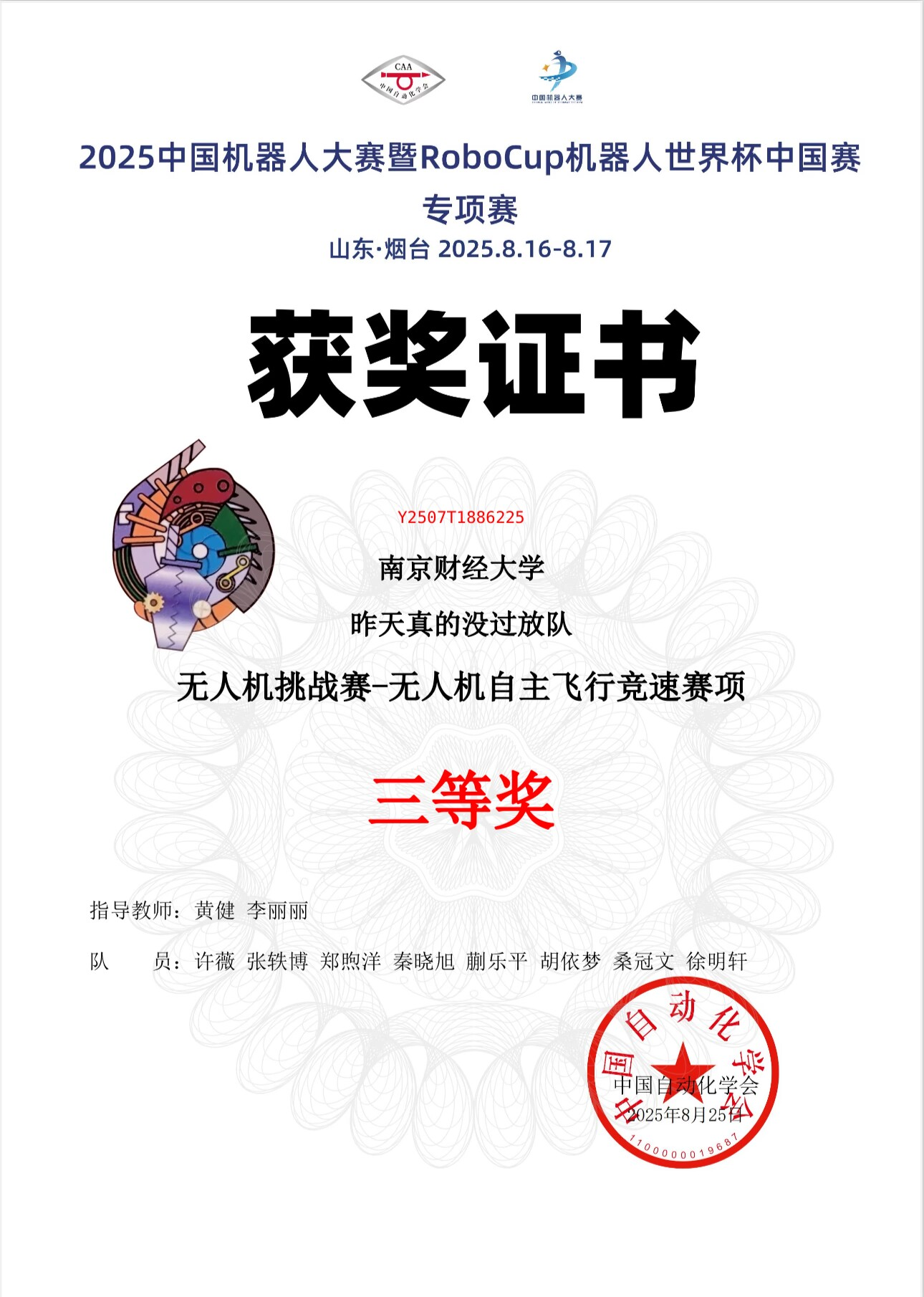 近日,2025年中国机器人大赛暨RoboCup机器人世界杯中国赛专项赛在山东烟台举行。由我张轶博、郑煦洋、许薇、刘祥、齐子峻组成的专业修车队在指导老师章磊的精心指导下,经过激烈角逐,斩获工程竞技类机器人-车型智能搬运赛一等奖;由许薇、张轶博、郑煦洋、秦晓旭、蒯乐平、胡梦、桑冠文、徐明轩组成的“昨天真的没过放”队在指导老师黄健、李丽丽的精心指导下,斩获无人机挑战赛——无人机自主飞行竞速赛项三等奖。