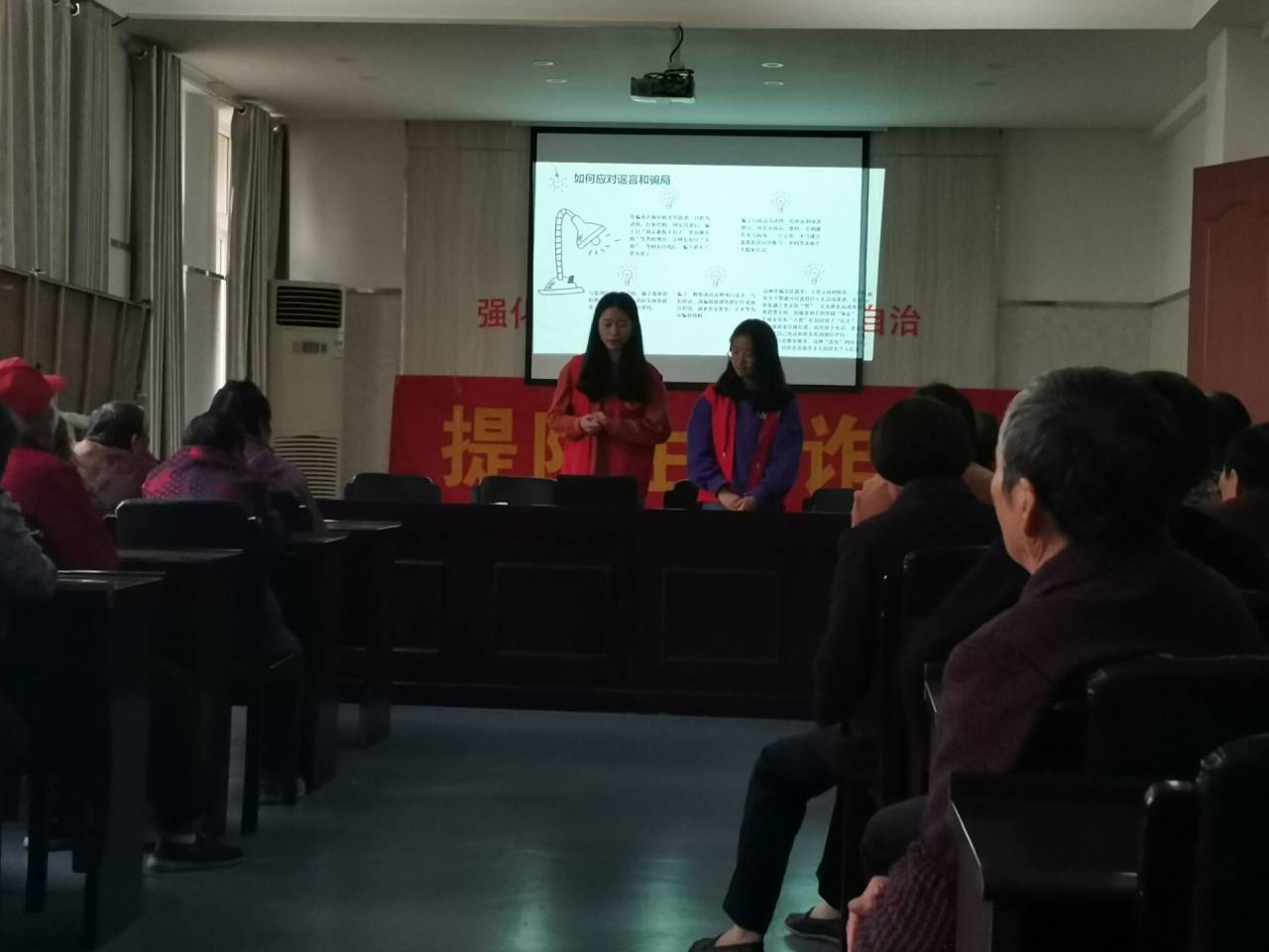 紧接着志愿服务部的部长们通过PPT呈现并且结合详细讲述的方式,让老人们更加清楚地了解了双十一砍价活动的实质、微信上的虚假言论以及如何应对谣言和骗局的方法。