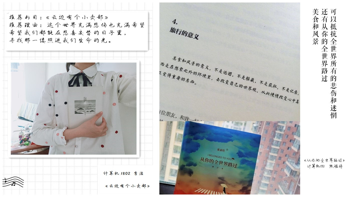 为了让大家能在疫情期间沾染更多的“书香气”,信息工程学院学生会为大家组织了一场主题为“云间赏书”的线上读书分享会,许多同学都在线分享他们心目中的好书籍。这些书籍有小说、散文,也有专业学习书籍,每个人都能在书中找到与自己心灵契合的点。参加读书分享会的软件1801班裴盈盈同学说:“读万卷书行万里路,疫情防控期间也许我们没法走出家门探寻世界,但书籍是我们最好的无声朋友,通过阅读我们也可以阅览世界。”疫情期间,读一本好书,可以说是多了一位知心的伙伴,让同学们在沉闷的生活里透进春日的暖阳。