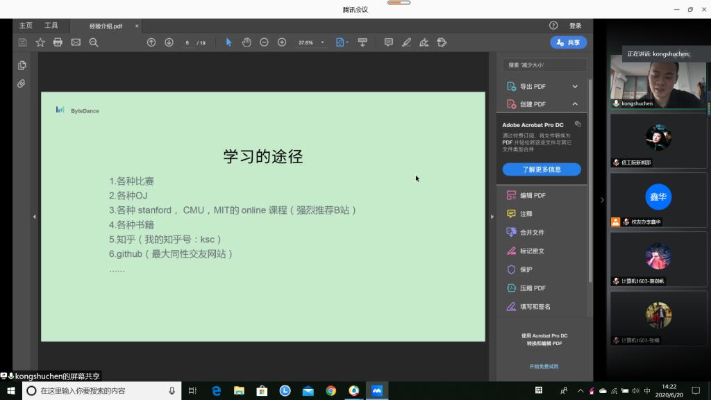 6月20日14:00,在信息工程学院校友办组织下,“励志生涯,逐梦人生”优秀校友在线讲座成功举办。本次会议旨在帮助同学们进一步树立正确的就业、创业观念、明确职业生涯规划目标,为有需求的同学们提供交流机会,特别邀请到了优秀校友孔舒晨学长和杜泽宇学长来给同学们分享经验。