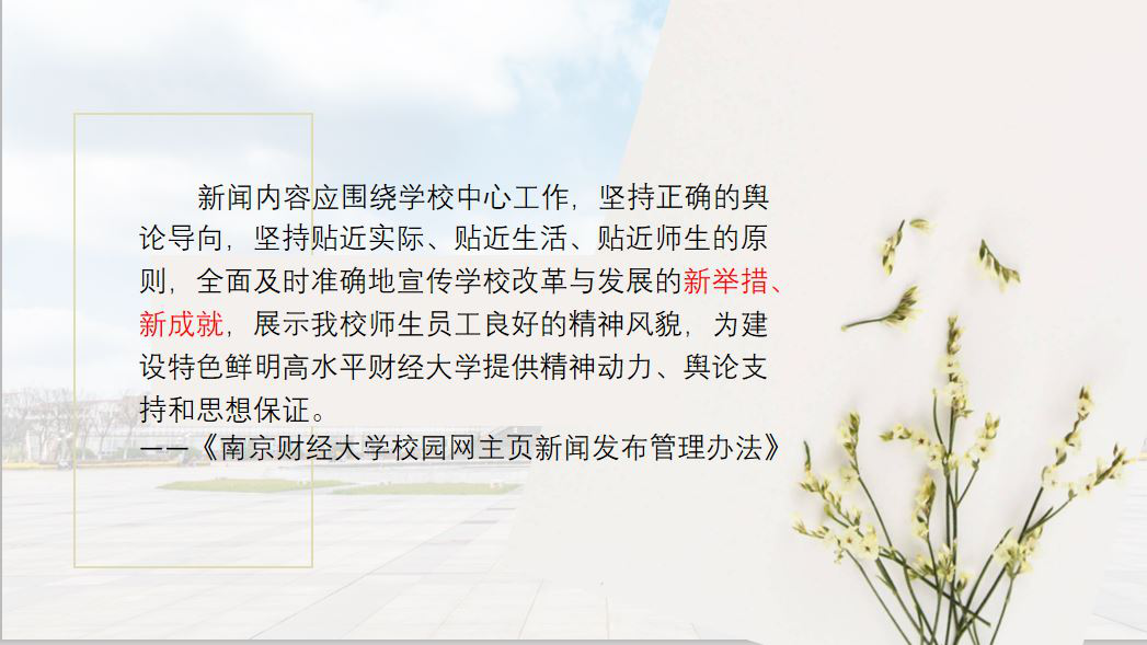 施卫娟老师在此次培训中结合新闻实例,深入浅出地介绍了外宣和内宣新闻稿件的类型、创意策划、写作技巧等。同时,鼓励培养一双善于发现的眼睛,在学生活动中创新,在自己身边发掘亮点、挖掘新闻。此外,施卫娟老师就消息、通讯、特写、人物专访、调查报告、新闻评论、社论、报告文学等新闻写作的特点详细介绍,并强调新闻宣传的内容应围绕学校中心工作,坚持正确的舆论导向,坚持贴近实际的原则,展示我校师生员工良好的精神风貌。