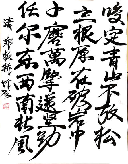 计算机1901周润雷同学的作品《竹石》堪称气节的典范,“千磨万击还坚劲,任尔东西南北风”,将草书与这首气节之诗相结合,挥洒自如之间自有一股狂放姿态,在艰难困苦面前,我们将理想信念深深的扎根在心中,克服了重重阻碍,在幸福生活到来之时,我们也不能放松,既不能向邪恶势力低头,也不能被眼花缭乱的景象所迷惑,不忘之前的狂风骤雨。