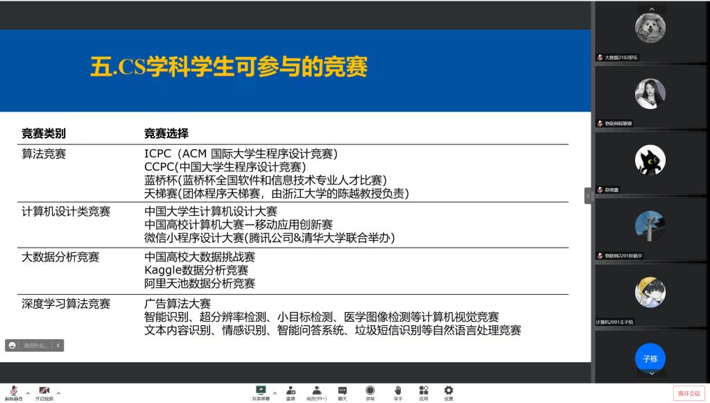 软件2001班周文同学详细地介绍了算法竞赛、计算机设计类竞赛、大数据分析竞赛和深度学习算法竞赛等CS学科学生可参与的竞赛,还分享了许多学习的平台,鼓励同学们多学习专业技能、打牢专业基础,不断提升综合竞争力。