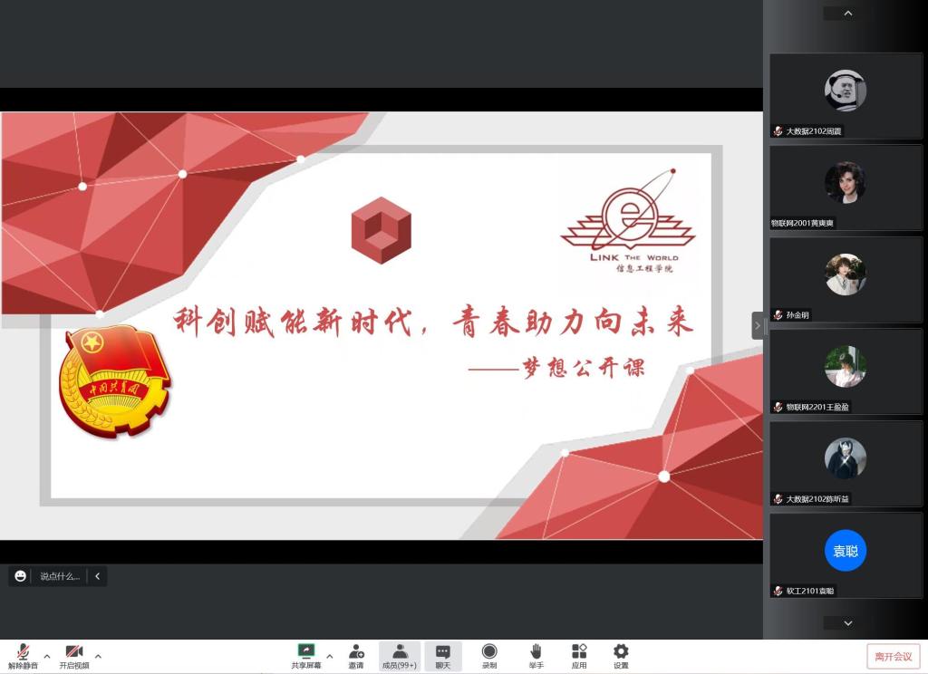 为帮助2022级新生了解专业科技竞赛及创新项目,激发同学们创新意识,10月28日晚,信息工程学院在线召开了“科创赋能新时代,青春助力向未来”梦想公开课,2022级新生及青马班全体学员参加。