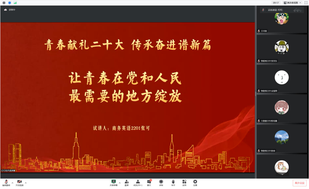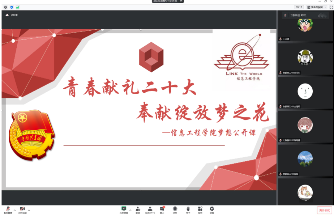 为激励新时代青年在为人民服务中茁壮成长,在艰苦奋斗中砥砺意志品质,在不断奉献中绽放理想之花,11月6日下午,信息工程学院在线举办了“青春献礼二十大,奉献绽放梦之花”梦想公开课,2022级全体同学及青马班全体学员参加。