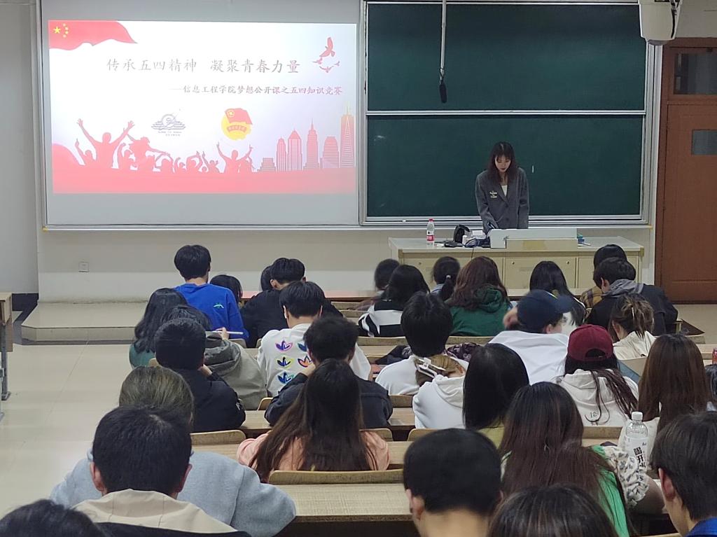 在五四青年节到来之际,为弘扬五四精神,铭记五四运动历史,激励同学们怀揣家国情怀,孜孜求学,担负起实现中华民族伟大复兴的历史重任,4月27日晚,信息工程学院在博远楼110教室举办了“传承五四精神,凝聚青春力量”梦想公开课暨五四知识竞赛。