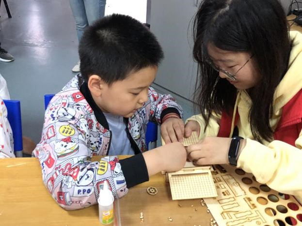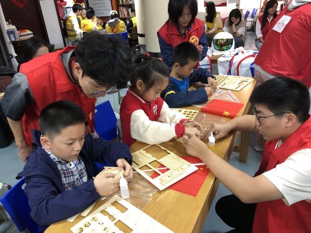 宣讲结束后,在志愿者们的协助下,社区儿童开始为宇航员石膏娃娃进行涂鸦,并借助志愿者们提前准备的模型开始了“玉兔”月球巡视车的创作。志愿者和孩子们打成一片,细心的为孩子们讲解每一步的细节与注意事项。