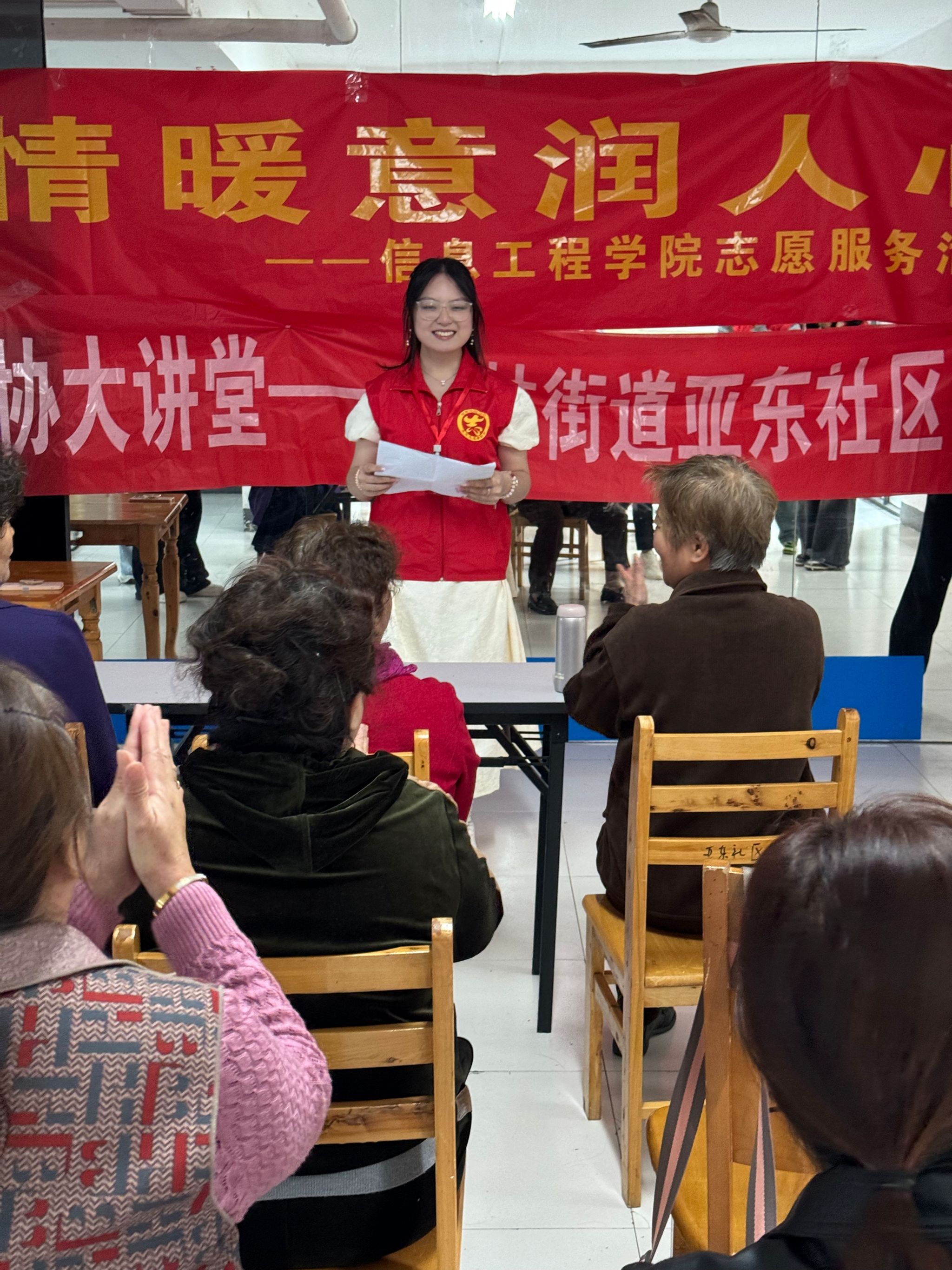 活动初始,志愿者们用一场温暖且实用的敬老爱老宣讲成功破冰。他们从日常生活中的点滴小事讲起,详细介绍了老年人日常生活中的注意事项,如健康饮食、适度运动、心理调适等等。老人们在乐趣横生的课堂中学到知识,现场气氛在一次次互动中推向高潮。宣讲成功帮助老人们学会了实用生活小技巧与保持健康的小秘诀,为他们的生活带来了欢笑与活力。