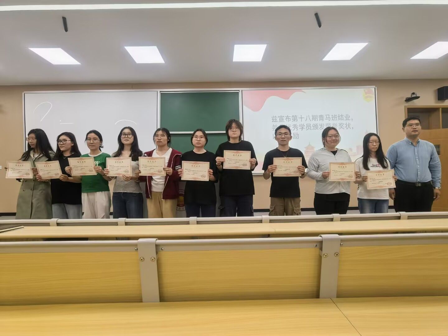 随后,主持人杨贺宣布第十八期青马班优秀学员名单,院党委副书记马健为获表彰同学颁发荣誉证书。沉甸甸的证书不仅是对学员们在理论学习中深学细悟、社会实践中担当作为、志愿服务中甘于奉献的高度肯定,更承载着学院对青年骨干的殷切期望。