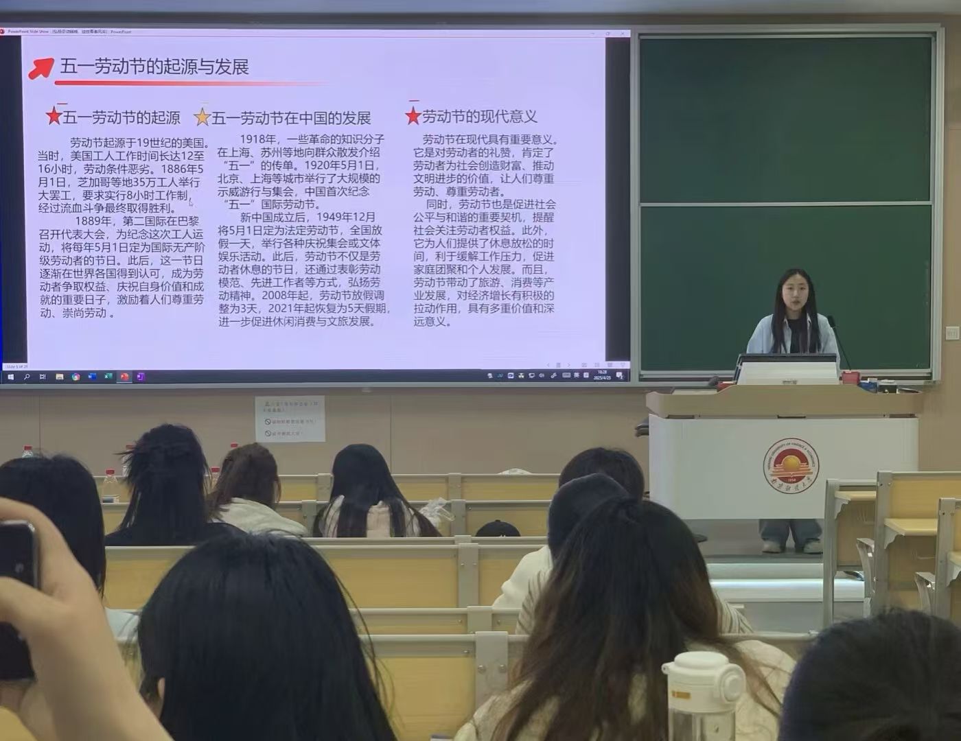 活动伊始,主持人蒋瑞彤带领同学们进行了理论学习,深入学习了习近平总书记关于劳动精神的重要论述,解读劳动精神的内涵。同时介绍了五一劳动节的起源与发展,指出劳动节是促进社会公平与和谐的重要契机。并与同学们一同观看劳动主题视频,体会新时代劳动者的风采和工匠精神。