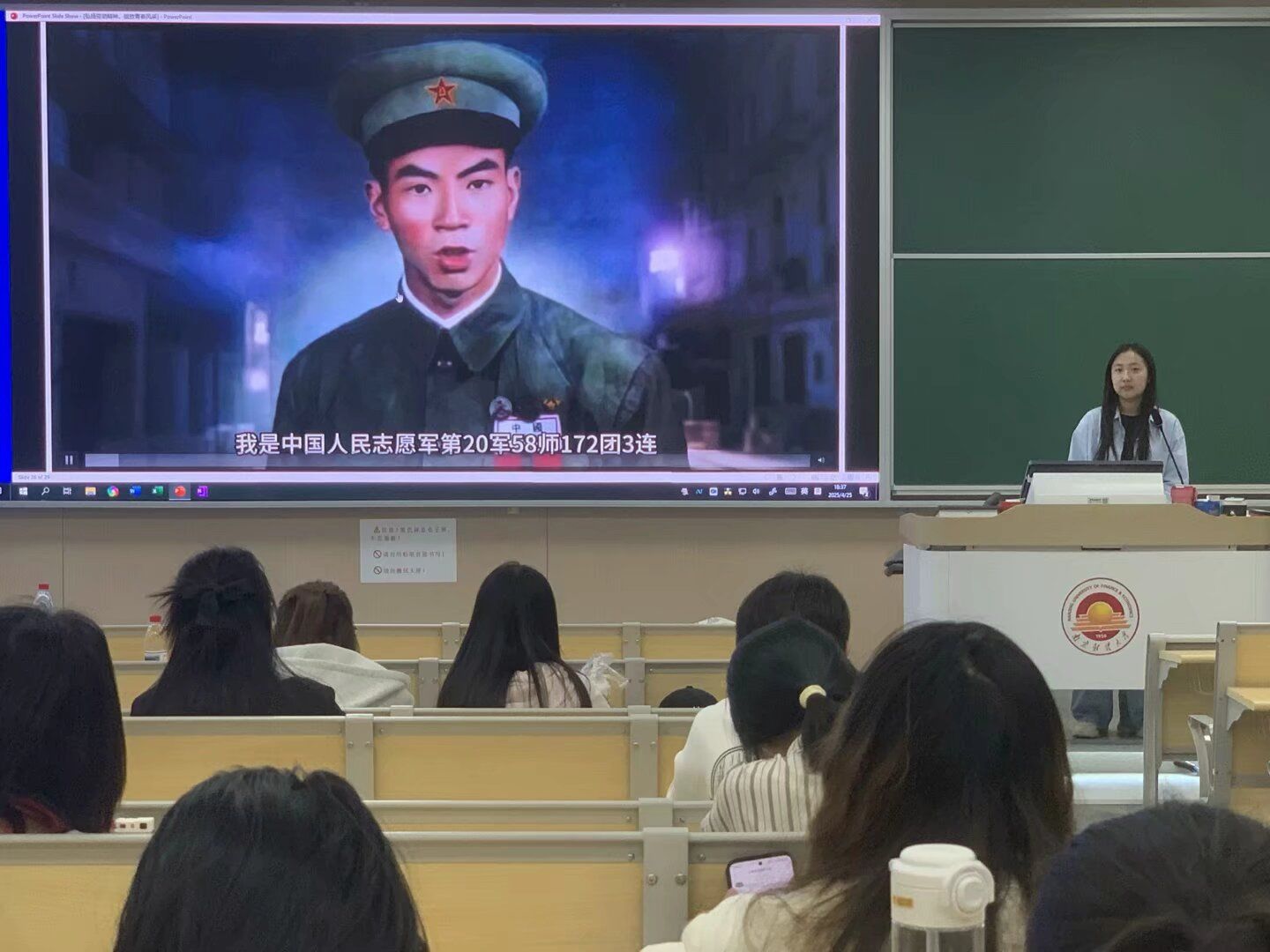 在互动环节,通过虚拟现实与语音合成技术,屏幕上“出现”了杨根思烈士的形象。他身着军装,神情坚毅,与现场同学展开跨越时空的对话。视频里同学们向杨根思前辈汇报了21世纪的国防建设和人民生活:解放军现代化部队现状、东风系列导弹“东风快递”的威慑力量,以及“祖国人民吃饱肚子、不再挨饿”的民生改善成就。杨根思认真倾听,并就当年长津湖畔1071.1高地东南侧小高岭的激烈战斗进行了回顾:他说,当年敌军火力凶猛,我志愿军战士以血肉之躯筑起钢铁长城,捍卫了国家尊严和人民安宁。