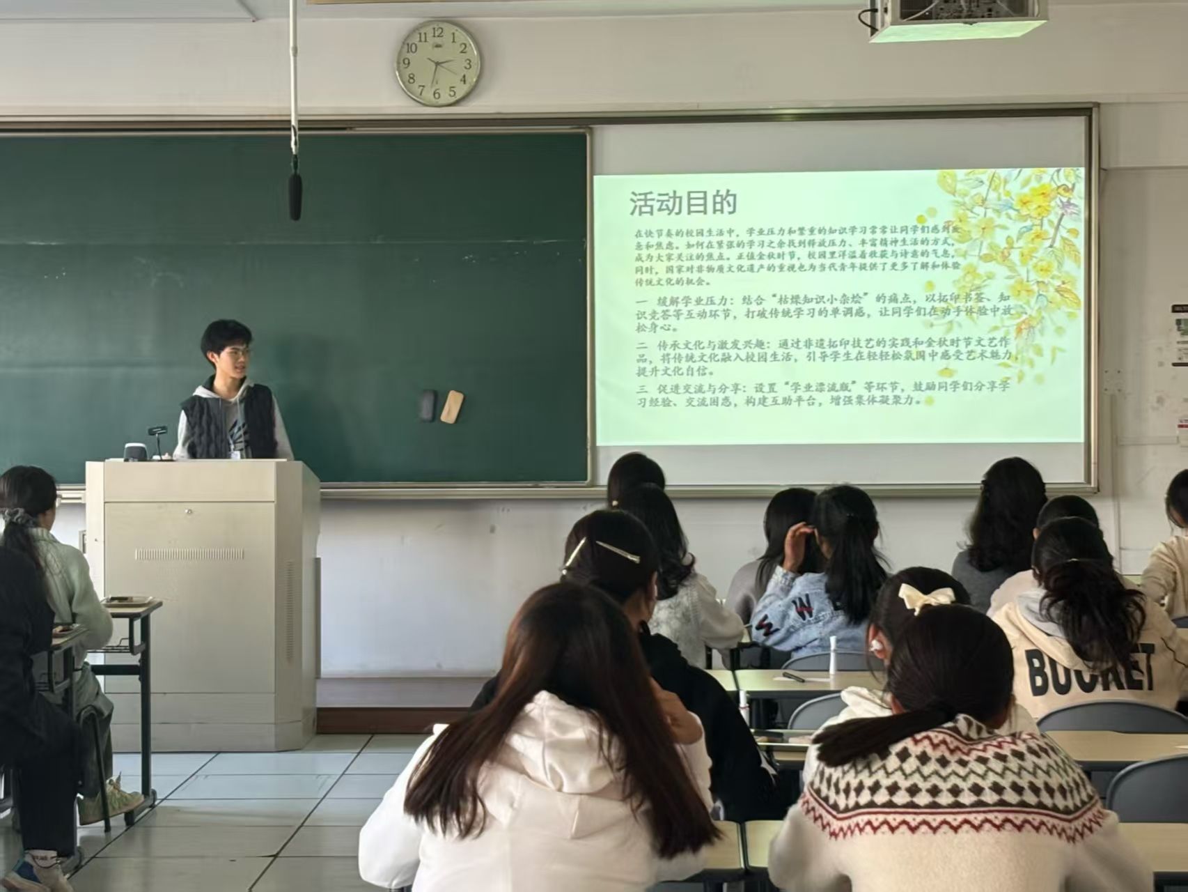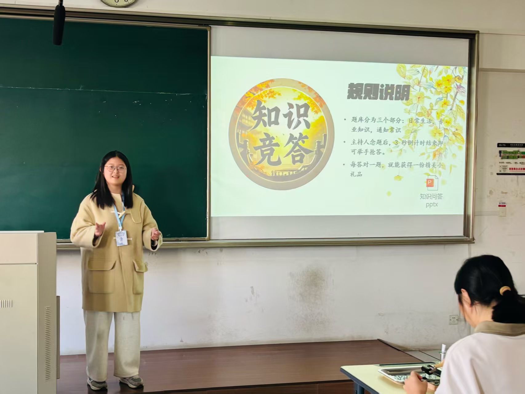 “知识竞答”环节则充满了紧张与趣味。主持人宣布倒计时结束后,抢答环节正式开始。题目内容广泛,涵盖通知常识、专业入门知识以及校园生活点滴。同学们踊跃举手,争相作答,现场气氛热烈非凡。每答对一题,即可获得精美的书签、明信片等小礼品,这不仅激励了大家积极参与,更让大家在轻松欢乐的氛围中积累了知识,拓宽了视野。