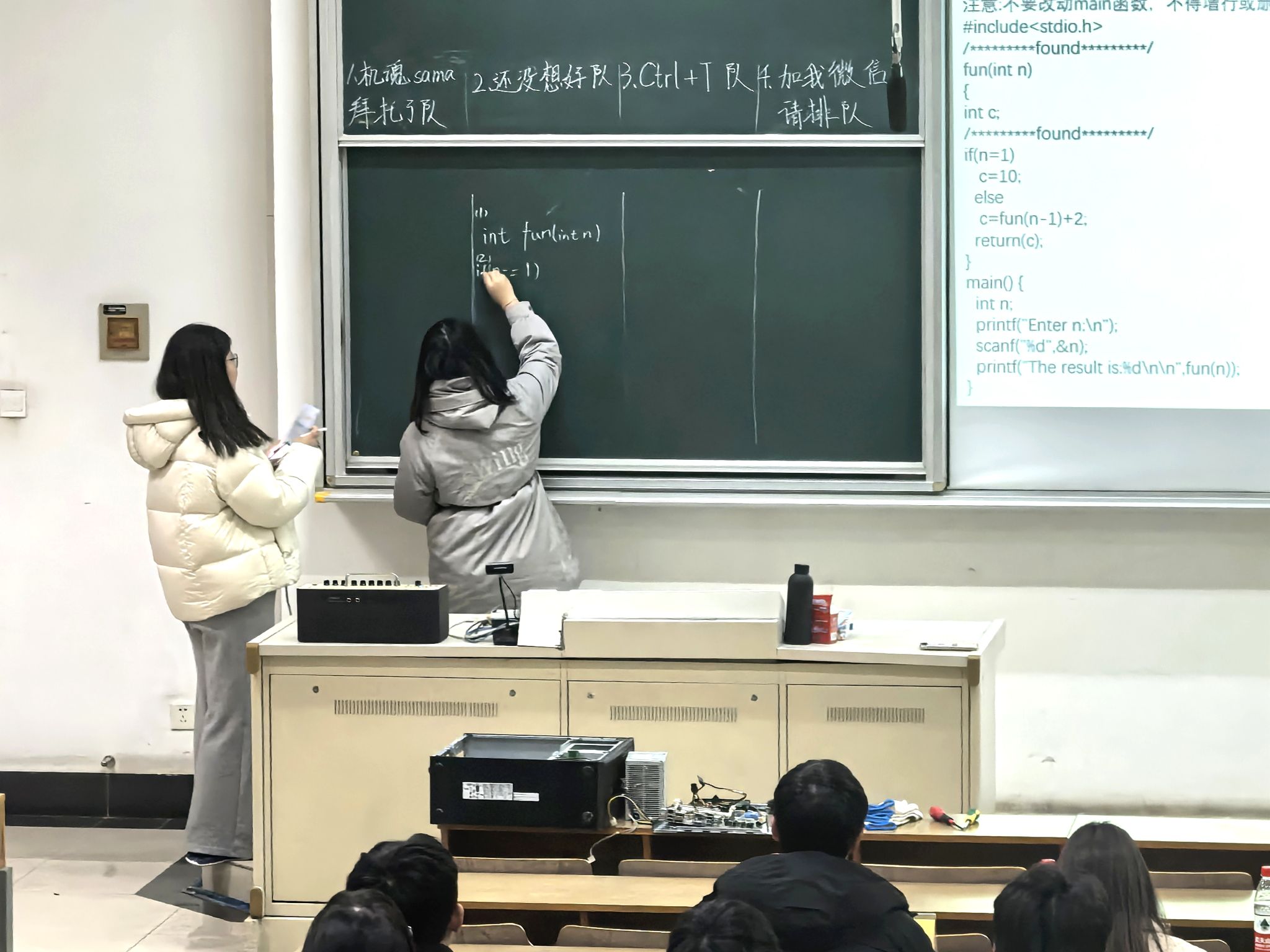 紧接着是更加令人紧张的抢答环节。题目展示后,各参赛队伍迅速进入思考状态,1分钟的准备时间里,队员们低声交流、快速推演。随着主持人“抢答开始”的指令落下,各队选手紧盯屏幕、指尖疾点,小程序后台的抢答数据实时刷新,瞬间决出答题顺序。每队的作答手紧握手中的粉笔,在黑板上写下一行行清晰的代码,折射出团队中每个人思维的闪光点。