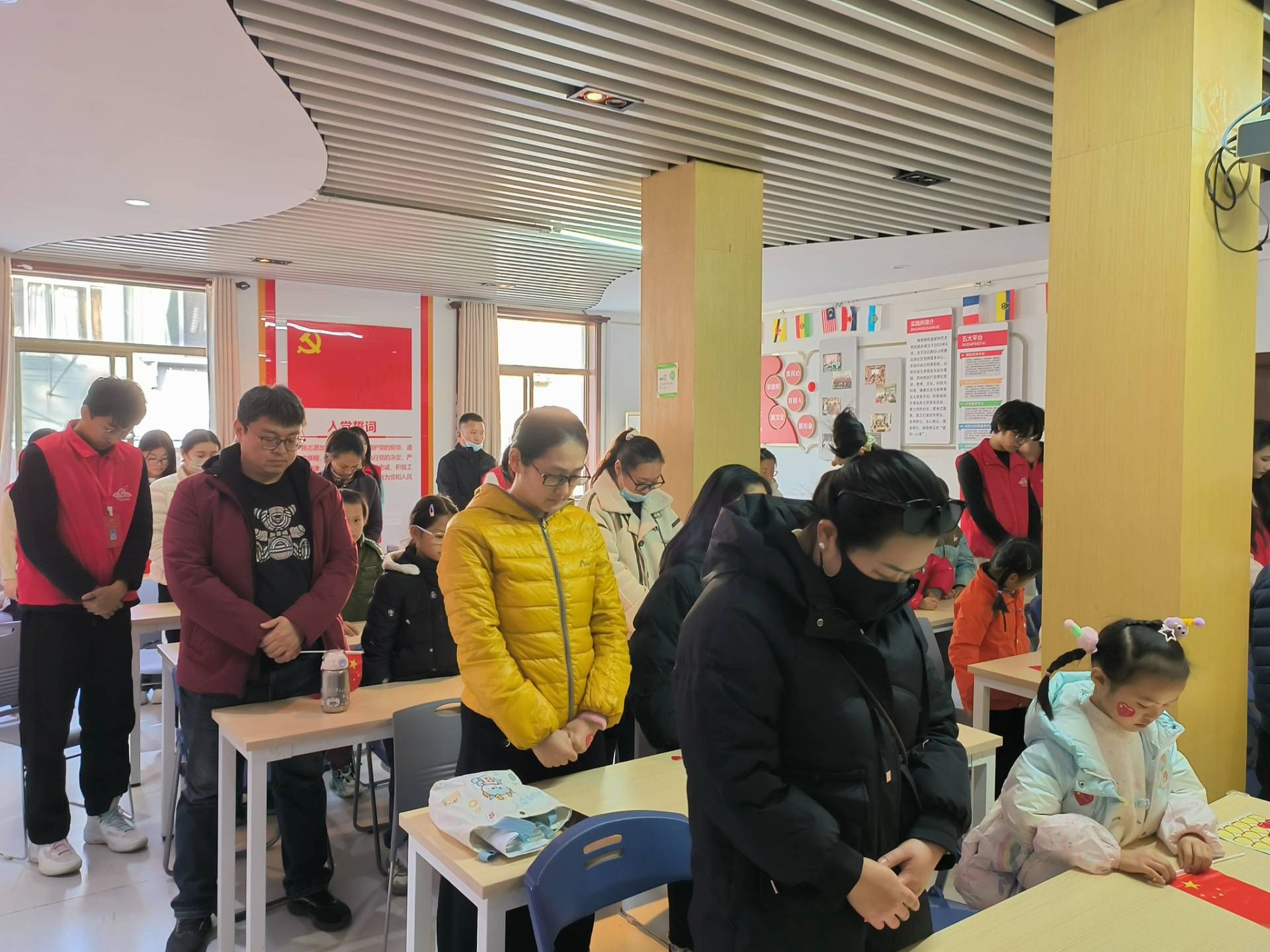 活动开始前,志愿者向孩子们发放了小国旗,随后,活动在肃穆的氛围中拉开序幕。志愿者主持人以温和而坚定的声音,向围坐的孩子们讲述了国家公祭日的由来与意义。“12月13日,是我们共同纪念的日子……”配合着和平主题的短片与图文卡片,一部厚重的历史卷帙,在孩子们面前徐徐铺展。在场所有小朋友手执发放的小国旗,在志愿者的带领下静静肃立,完成一分钟默哀。教室只剩下无声的缅怀,清澈的眼眸中映照出对历史的敬畏。一颗名为“铭记”的种子,悄然落入心田。