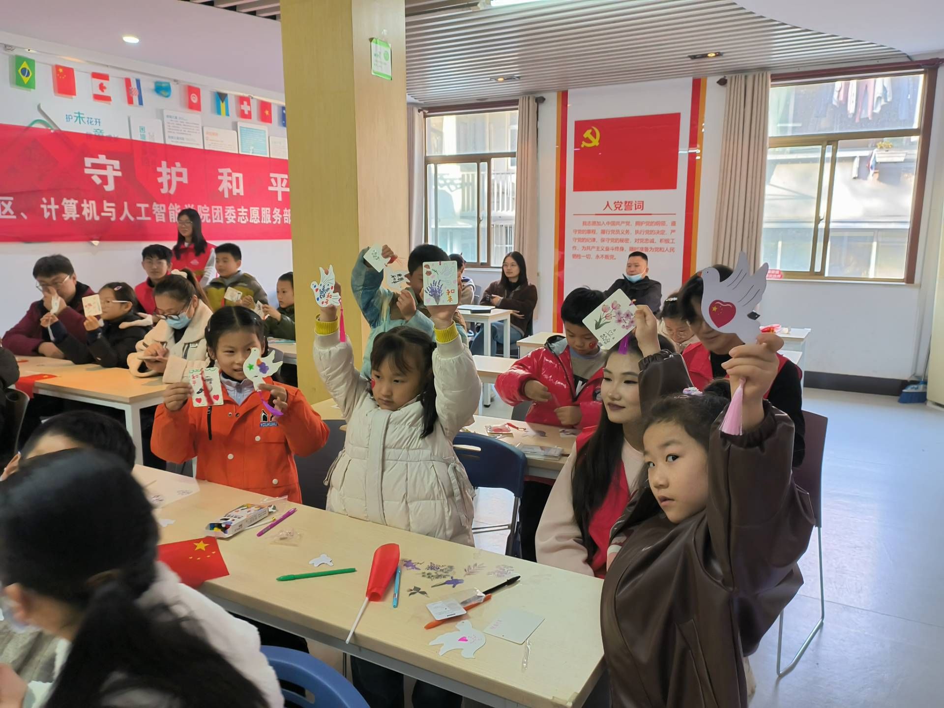 “大家觉得,和平是什么颜色的?”在“和平故事小课堂”上,志愿者通过生动的故事和启发式的提问,引导孩子们展开想象的翅膀。从蔚蓝无瑕的天空,到邻里欢笑的温暖,孩子们用稚嫩的语言描绘出他们心中的和平图景。每一次的举手发言,每一个充满童真却意义非凡的回答,都获得了志愿者赠送的和平徽章作为鼓励。互动之间,“反对战争”“珍爱和平”不再是大而化之的口号,变成了孩子们可以感知和言说的具体画面与情感。