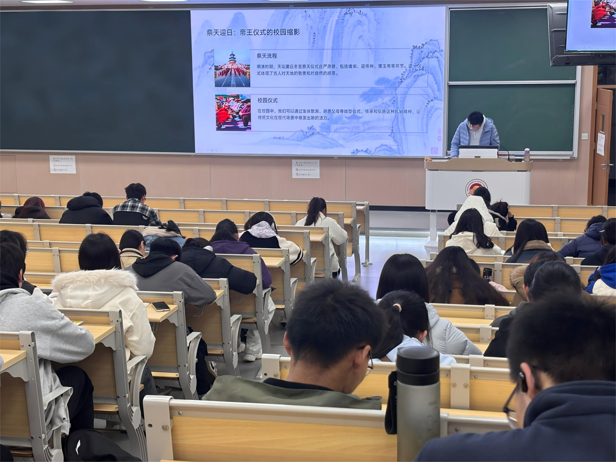 活动在温馨的氛围中拉开帷幕,主持人结合图文史料与古画素材,深入浅出地讲解了冬至的节气渊源、阴阳转化的文化寓意,以及南北方“吃汤圆”“包饺子”的习俗差异,辅以“冬至吃饺子不冻耳朵”的民间传说、古代帝王祭天迎日的历史典故,让同学们全方位领略了冬至文化的深厚底蕴。