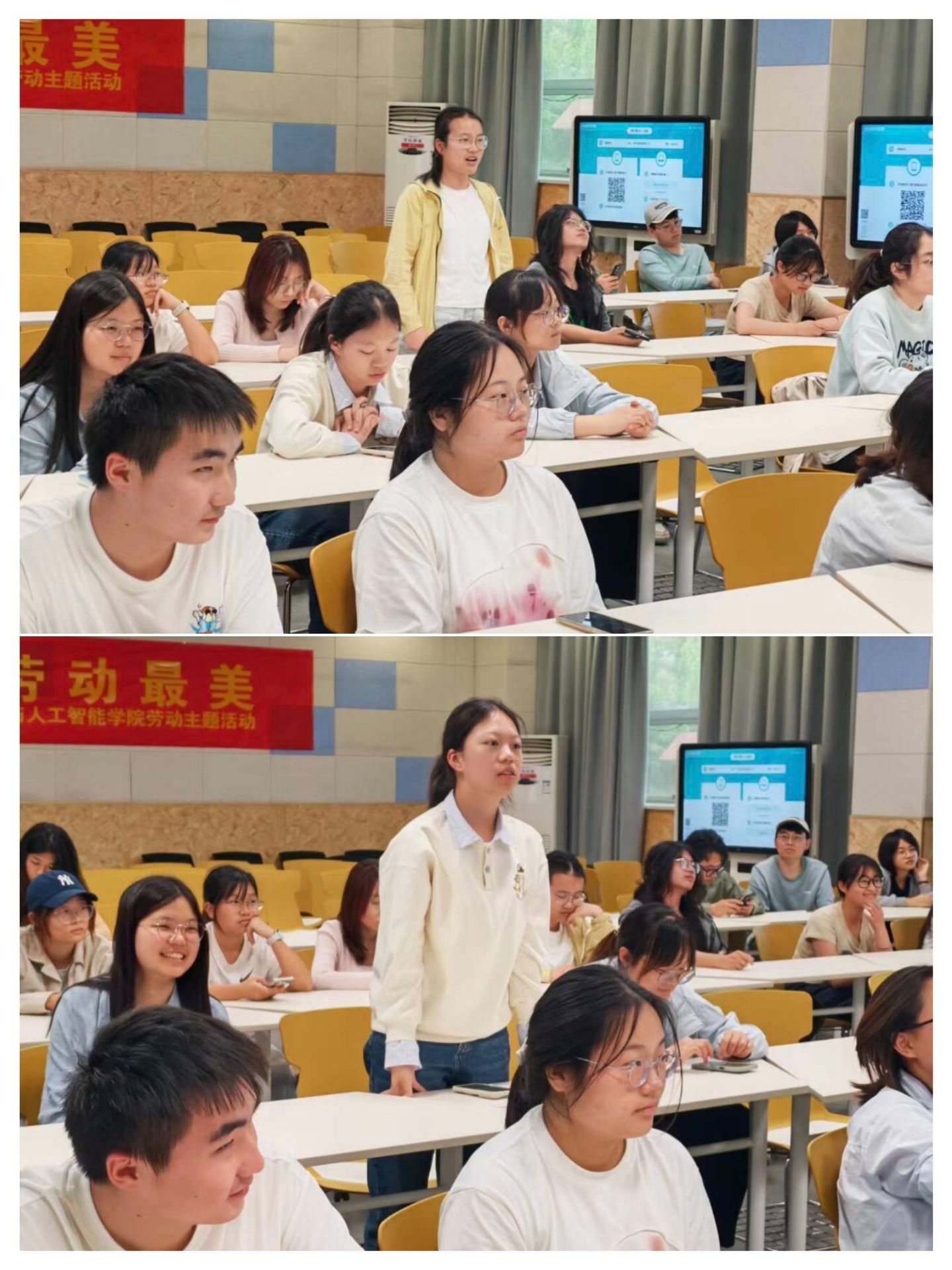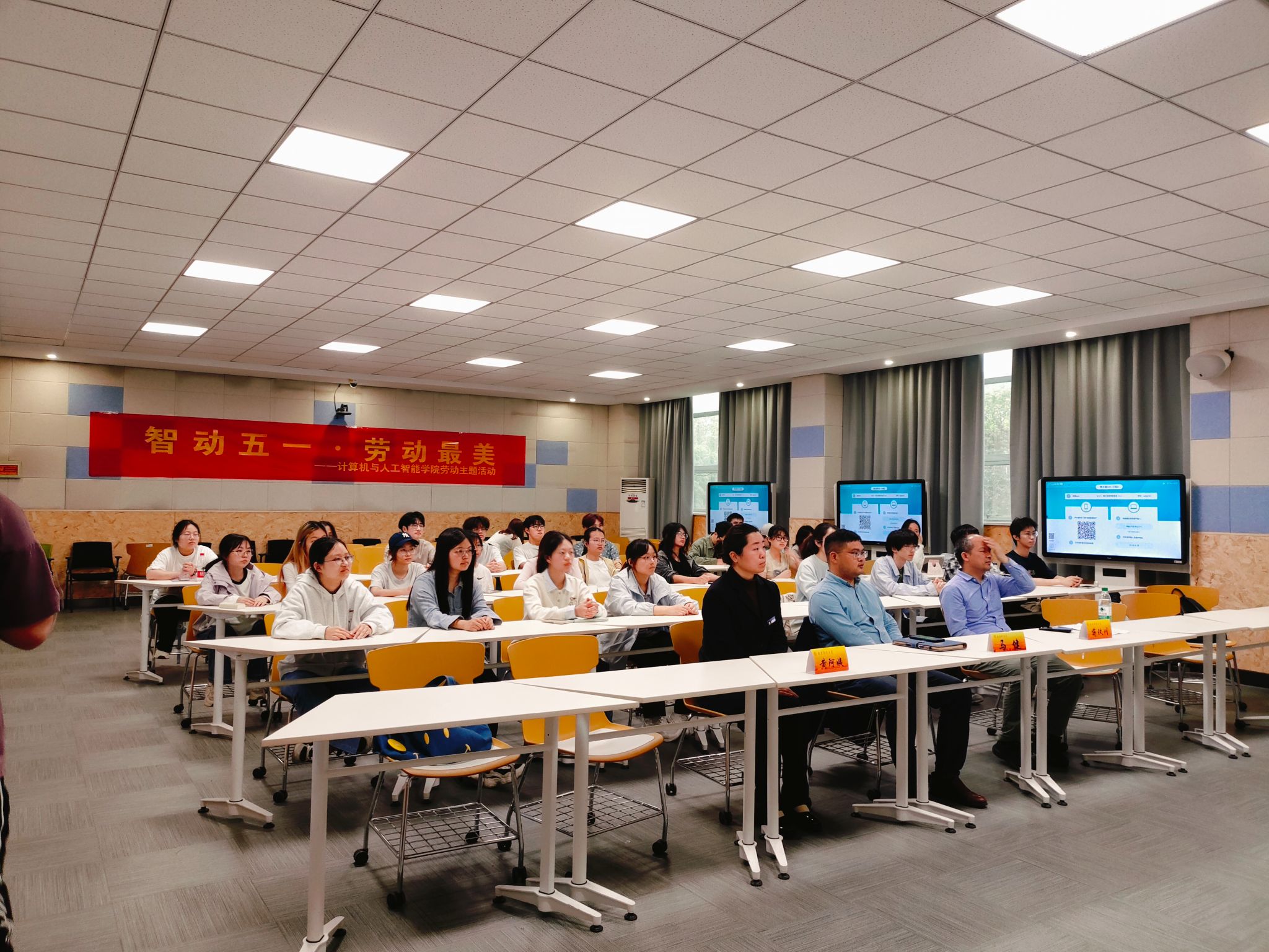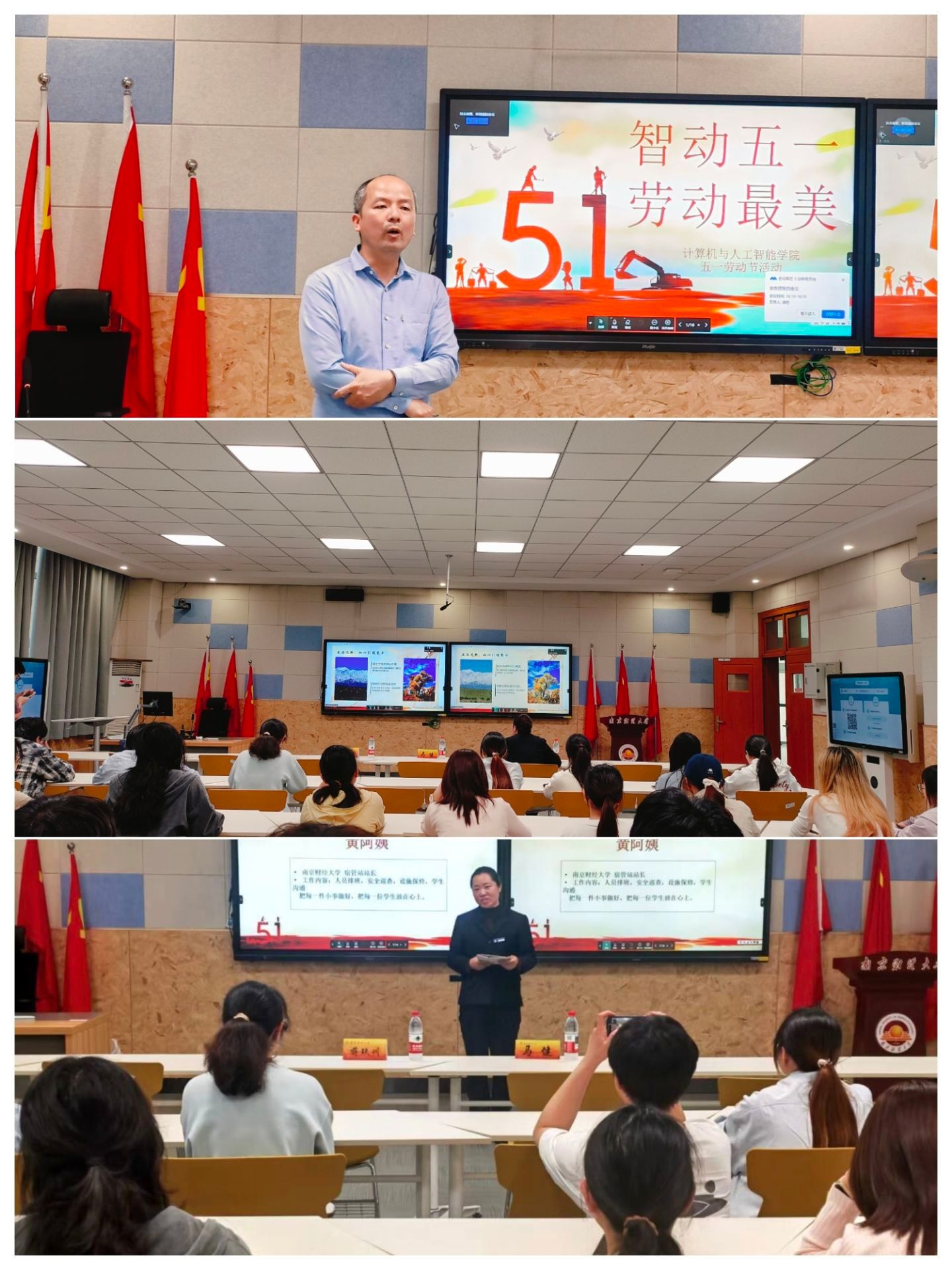 在劳动故事分享环节,三位嘉宾从不同岗位出发,讲述了生动鲜活的劳动故事。蒋玖川副教授结合人工智能与数据挖掘科研工作,分享了深耕学术、潜心研究的脑力劳动历程,诠释了“坚守与专注”的劳动内核;优秀毕业生欧阳煌煜学长通过线上连线,分享了放弃互联网offer、投身西部计划赴新疆服务的基层经历,展现了新时代青年扎根基层、服务社会的责任与担当;1号宿管站黄阿姨从日常管理、安全巡查、服务学生等点滴小事出发,用朴实语言讲述平凡岗位上的坚守与付出,让同学们深刻感受到劳动无高低、奉献最光荣。